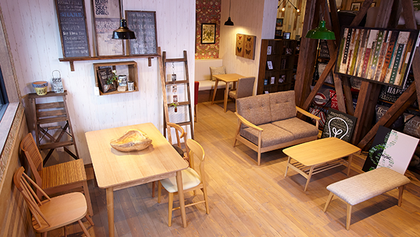 新しい家具と一緒に今までとちがう日々が運ばれてくる。 同じ部屋、違う日々。好きな物・趣味・暮らし方によってお部屋もお着替え。 Cafeスペースで使用している家具はお店で全て販売している家具です。 お茶を飲みながらゆっくり体感していただけます。